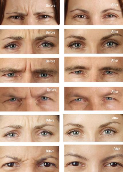 forehead, vertical lines between the eye brows, and crow's feet are